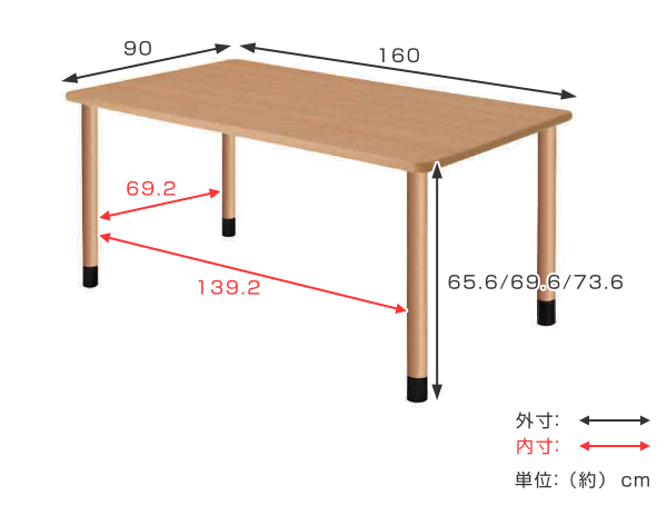 | サイズ | 約 幅160×奥行90×高さ73.6(cm) 3段階の高さ調節可能:65.6/69.6/73.6(cm) 天板厚み:2.6(cm) |
