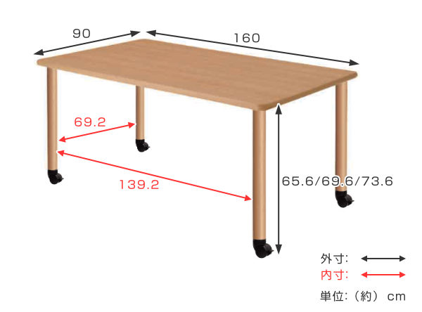 | サイズ | 約 幅160×奥行90×高さ73.6(cm) 3段階の高さ調節可能:65.6/69.6/73.6(cm) 天板厚み:2.6(cm) |