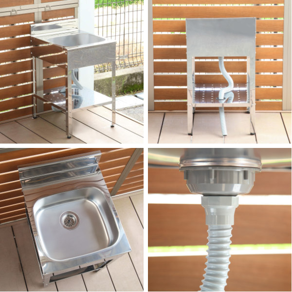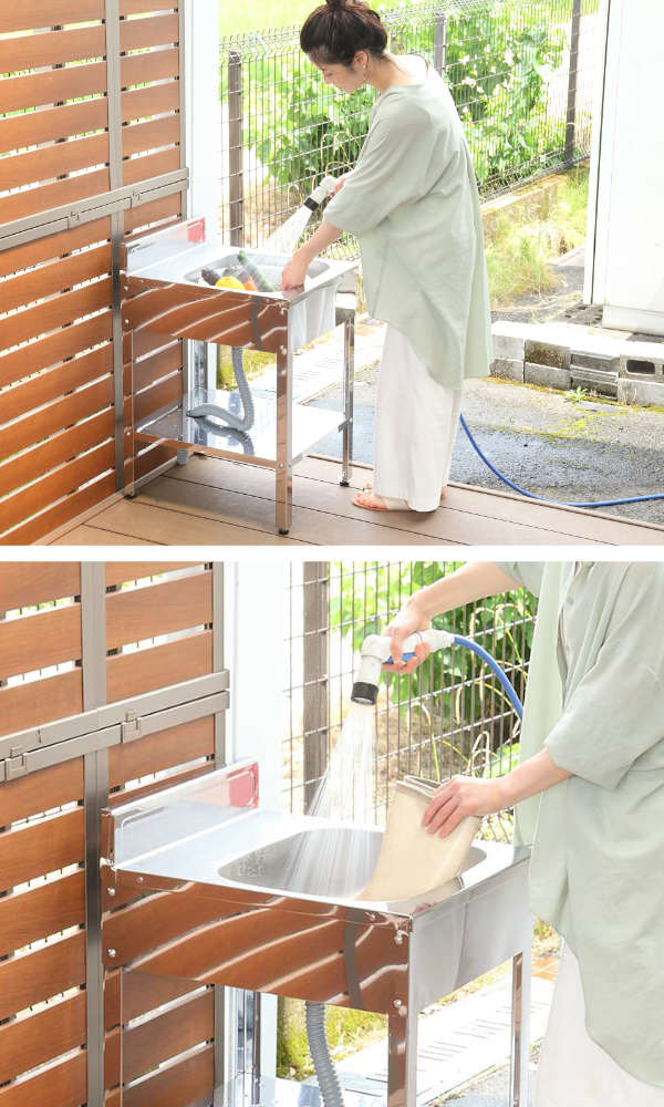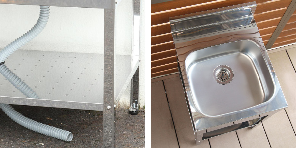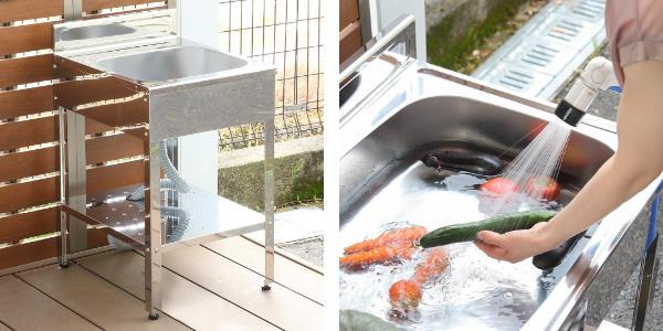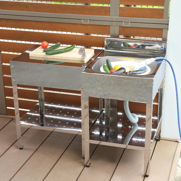 外でそのまま野菜が洗えて、錆びにくいステンレス製流し台