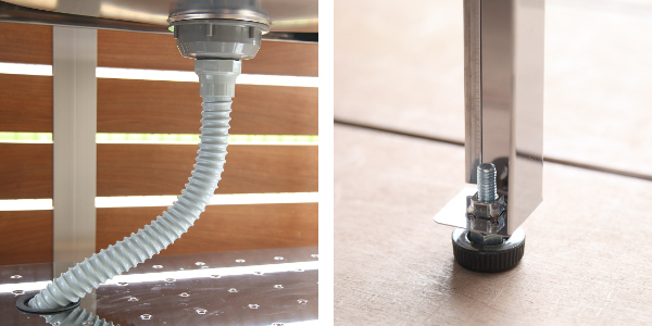 | 排水ホースもしっかり収納 棚板に排水ホースが通せる穴が開いているので、排水ホースがごちゃごちゃせずスッキリ収納出来ます。排水ホースは直径3.6cm、長さ80cmです。 | 高さを調整出来るアジャスター付き アジャスター付きで高さが約3cm微調整出来ますので、ガタつきにくくお好みの高さに合わせて頂けます。 |