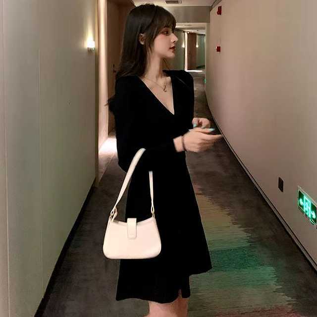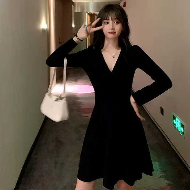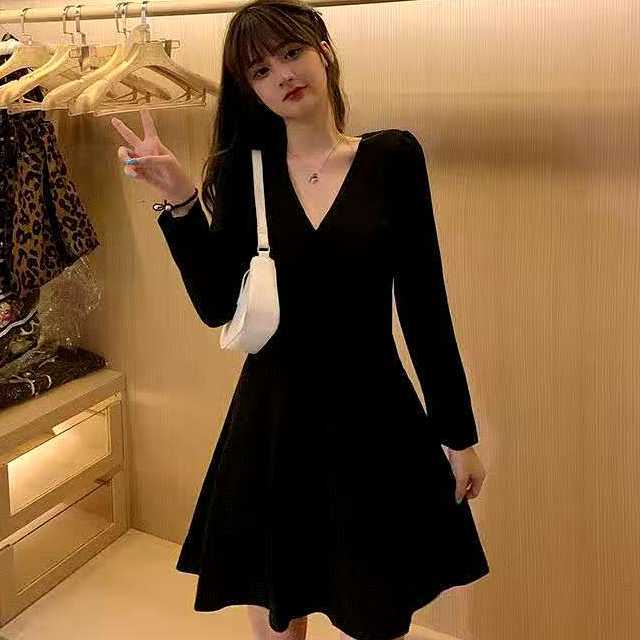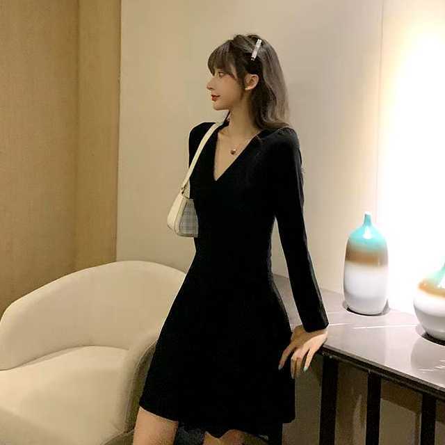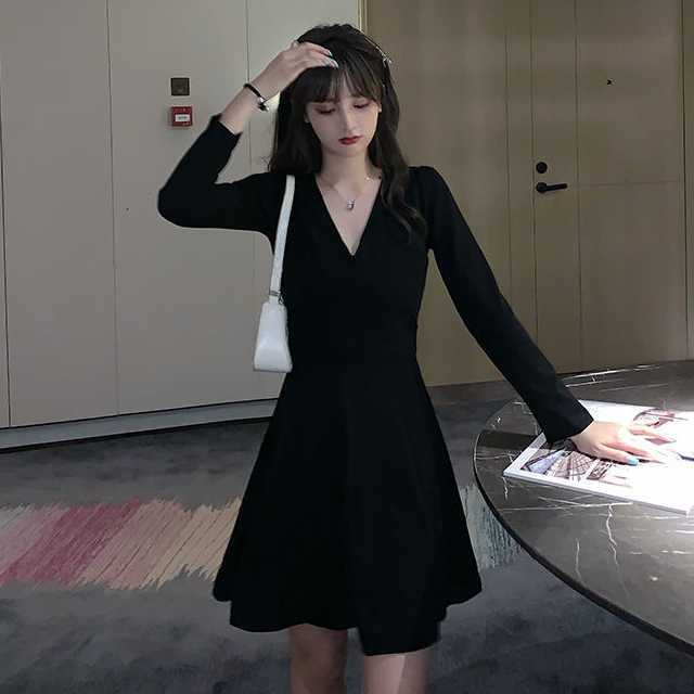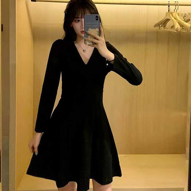 ワンピース ミディアムワンピース パーティードレス 大きめサイズ Vネック ハイウエスト 長袖 ミディ丈 セクシー 黒 お呼ばれ デート ディナー キレセク