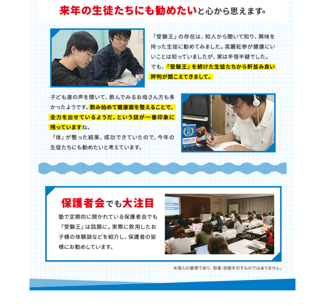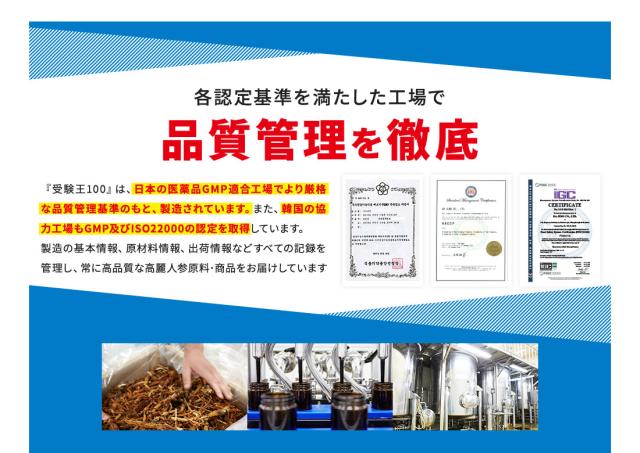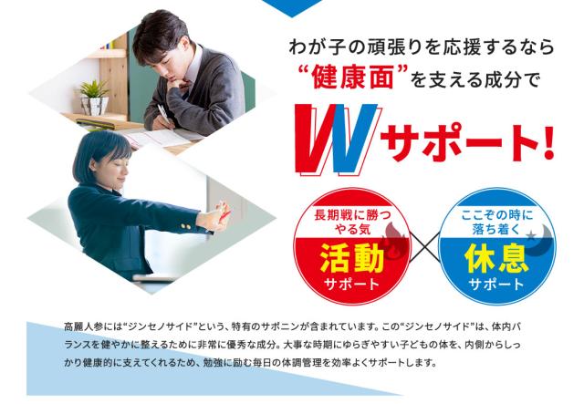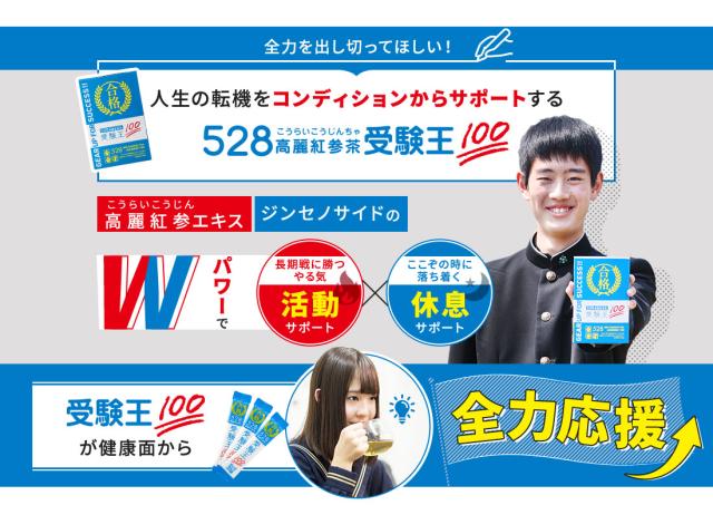受験大国・韓国で頻繁に飲まれているスーパーフード、それが高麗人参。愛飲される秘密は高麗人参に含まれるサポニン「ジンセノサイド」にあります。高品質なジンセノサイドを効率よく摂るためのお茶として開発したのが「528高麗紅参茶受験王100」です。 |