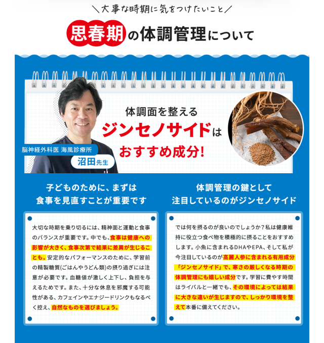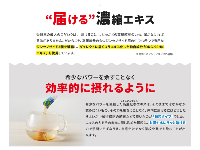 受験大国・韓国で頻繁に飲まれているスーパーフード、それが高麗人参。愛飲される秘密は高麗人参に含まれるサポニン「ジンセノサイド」にあります。高品質なジンセノサイドを効率よく摂るためのお茶として開発したのが「528高麗紅参茶受験王100」です。