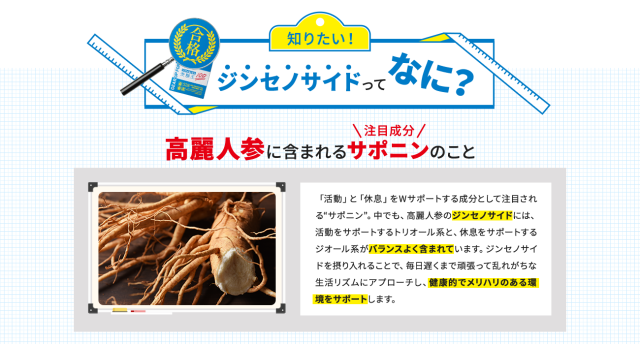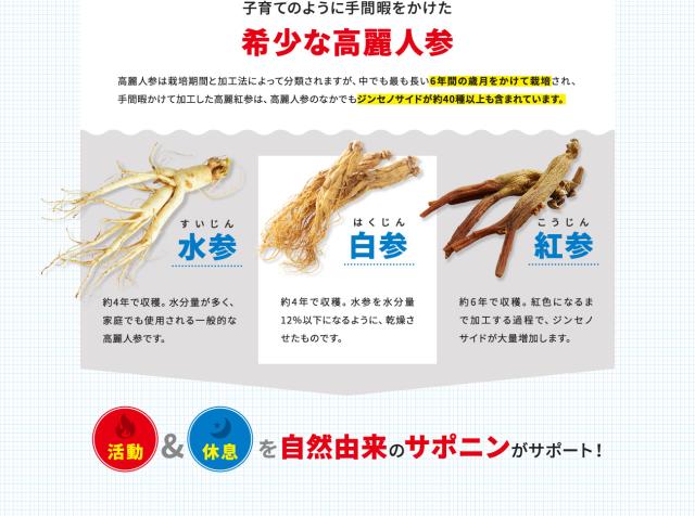 | 原材料名 | ブドウ糖、高麗人参(紅参)エキス、乳糖、ビタミンC |