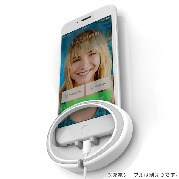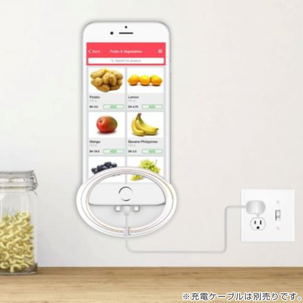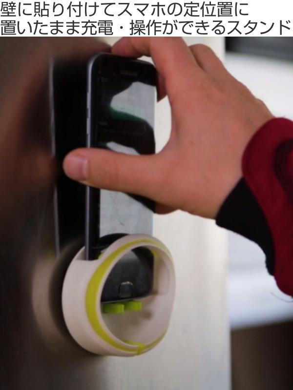 壁に貼り付けられる便利なスマホスタンドです。使用したい場所に背面の両面テープで貼り付け、スマホを置き充電ケーブル(別売り)を差し込んでお使いください。置いたまま充電・操作ができて便利です。