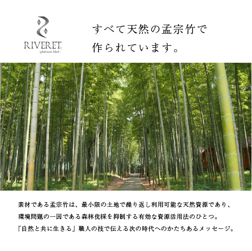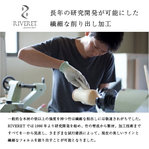 一般的な木材と比べ、倍以上の強度を持つ竹は、繊細な削り出し加工には敬遠されがちでした。RIVERETでは1986年より研究開発を始め、竹の育成から製材、加工技術まですべてを一から見直し、さまざまな試行錯誤によって、現在の美しいラインと繊細なフォルムを創り出すことが可能となりました。