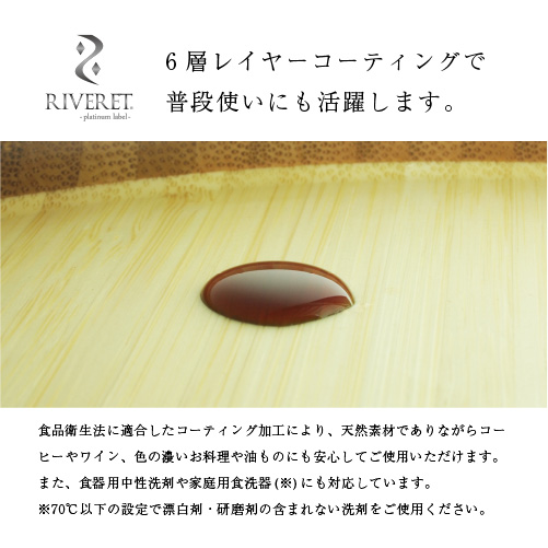 陶器やガラス製食器と同様に普段使いとしてご使用いただけるよう、竹の内部まで浸透させる独自開発コーティングを実施。(食品衛生法適合塗料)油もの、色の濃いお料理などの色移りや染み込みを防ぎます。