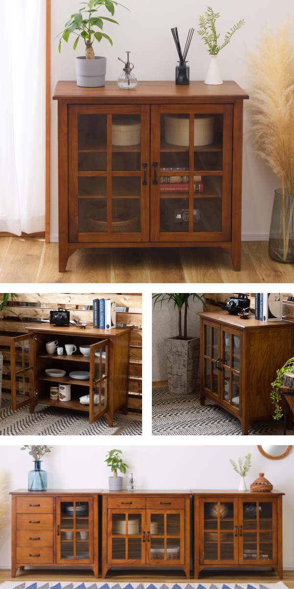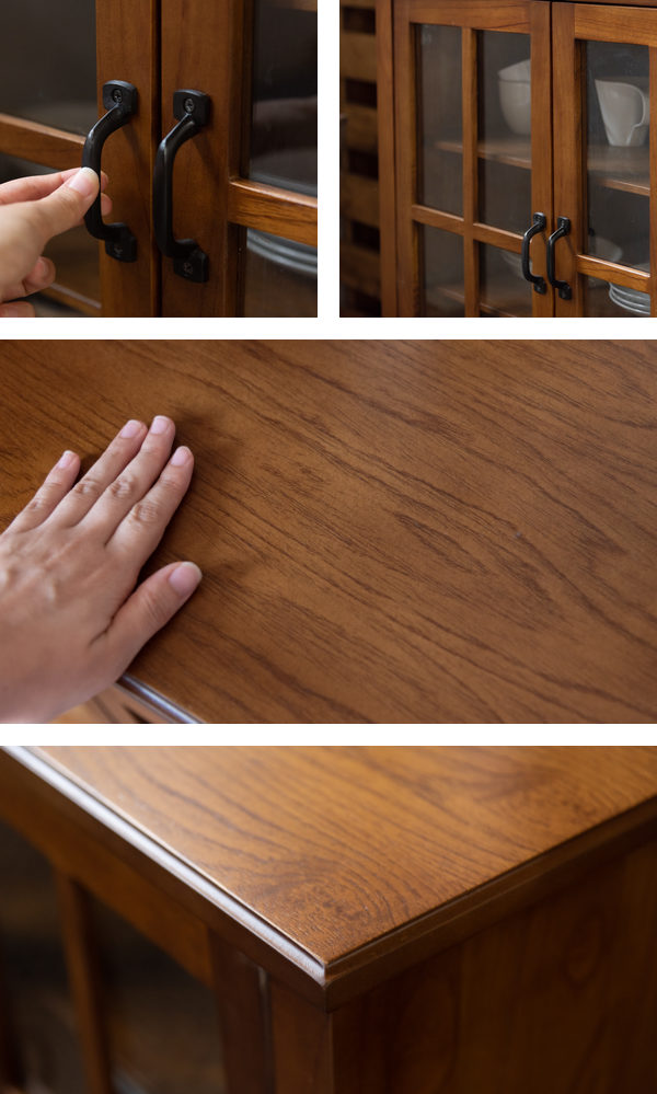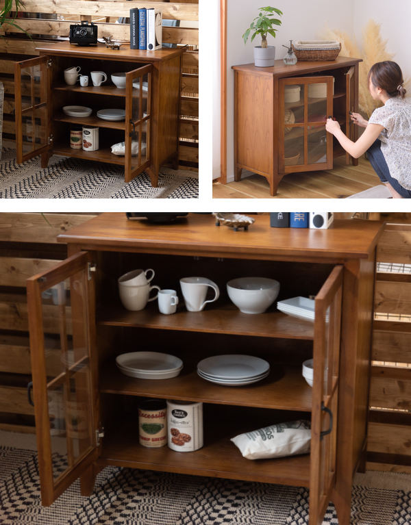 中に収納している物が一目でわかるガラス戸収納です。食器やお気に入りの雑貨などの見せる収納を楽しむことができます。3mmの強化ガラスを使用しているため、万が一の際にも大きな飛び散りを防ぐことができます。
