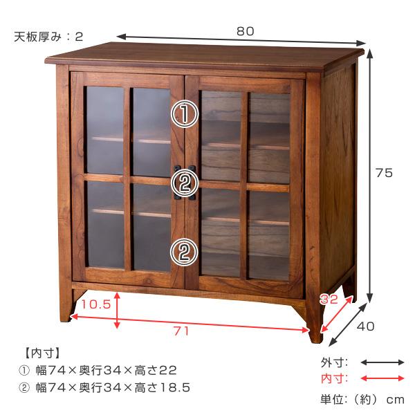 キャビネット 両開き ガラス扉 天然木 エスニック調 Timber 幅80cm ( リビング収納 食器棚 収納 キッチン 飾り棚 完成品 キッチンキャビネット レトロ ブラウン おしゃれ 本棚 おしゃれ)