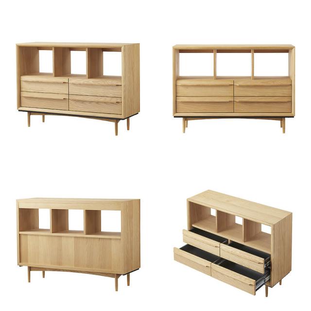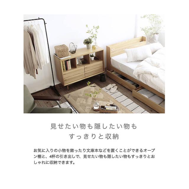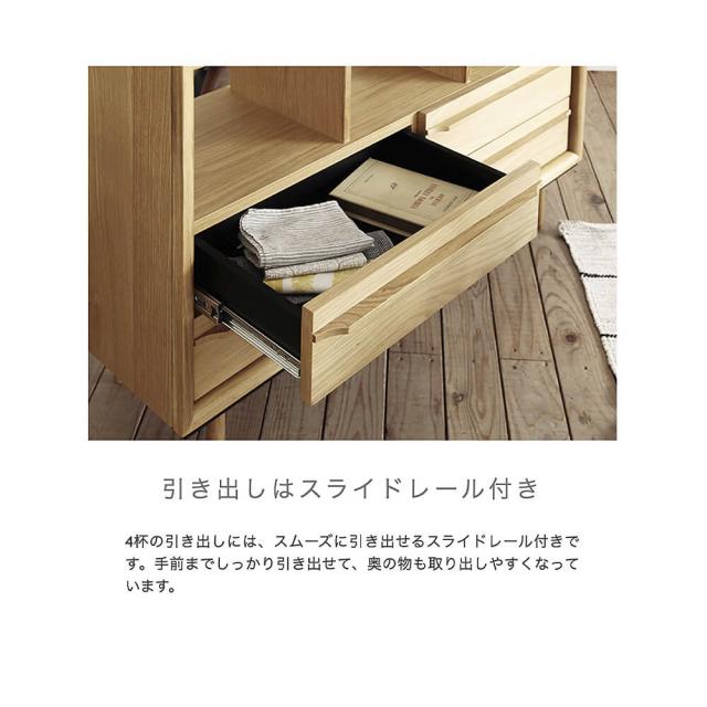 お気に入りの小物を飾ったり文庫本などを置くことができるオープン棚と、スライドレール付きで奥の物も取り出しやすい4杯の引き出しで、見せたい物も隠したい物もすっきりと収納できます。