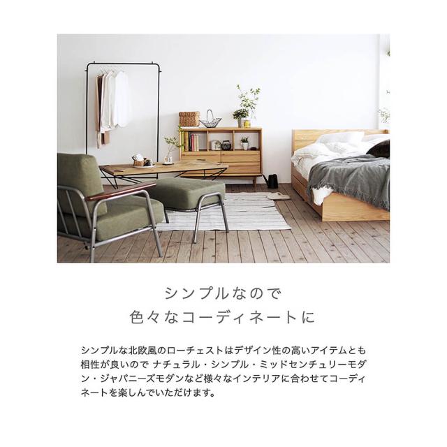 シンプルな北欧風のローチェストはデザイン性の高いアイテムとも相性が良いのでナチュラル・シンプル・ミッドセンチュリーモダンジャパニーズモダンなど様々なインテリアに合わせてコーディネートを楽しんでいただけます。