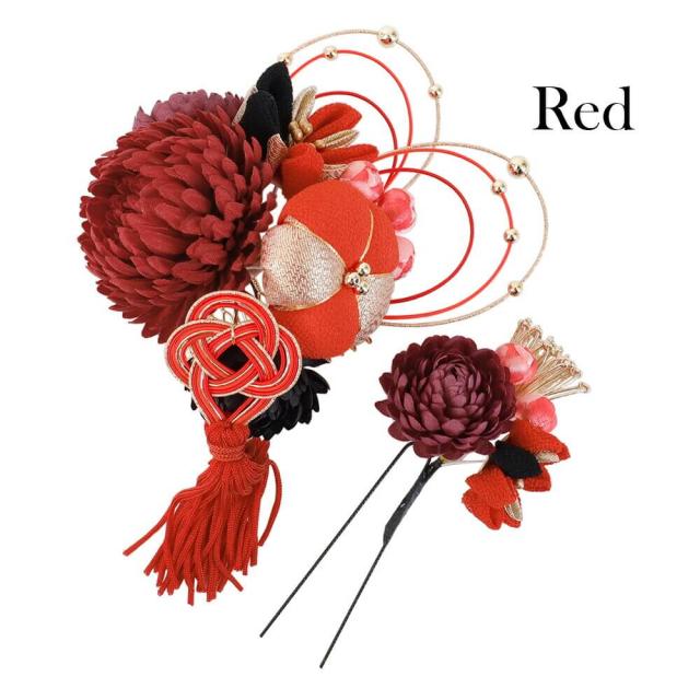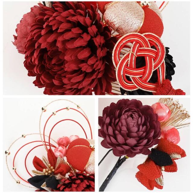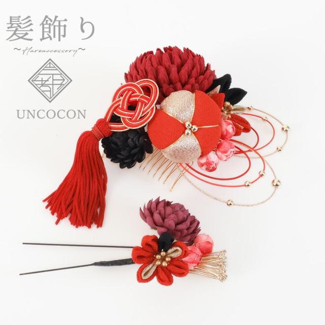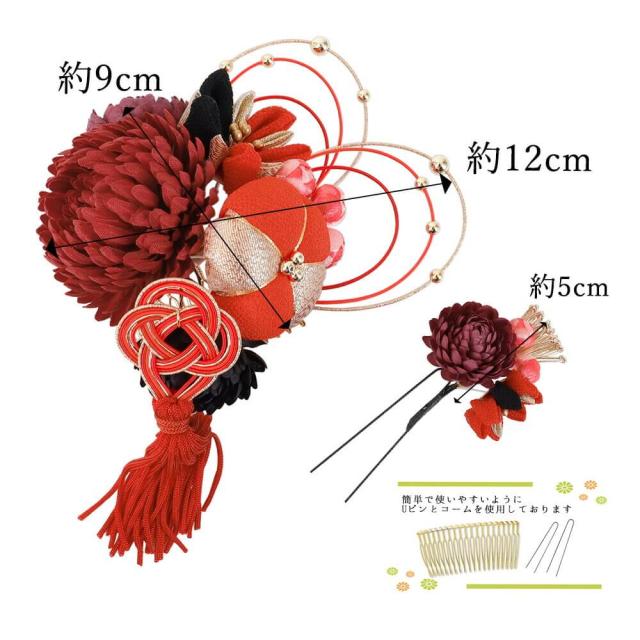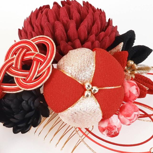 髪飾り 成人式 赤 つまみ細工 ピンポンマム ぶら飾り 組紐 Uピン髪留め 卒業式 振袖 前撮り 着物 袴 日本製 赤 黒