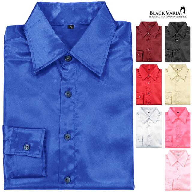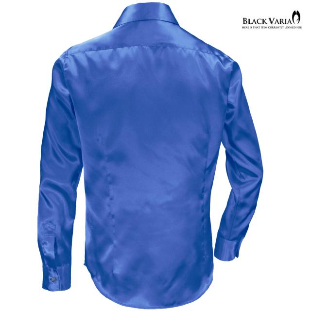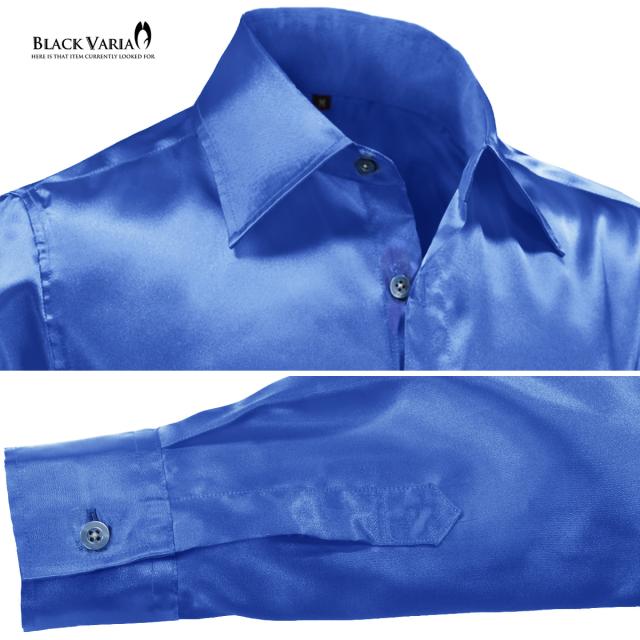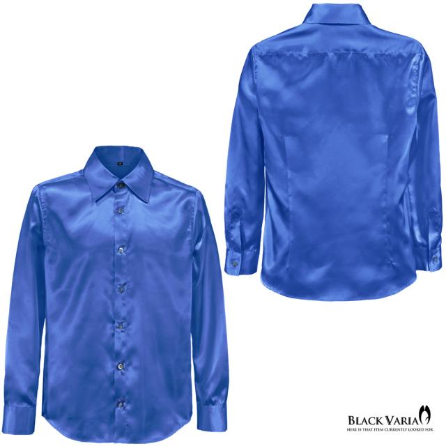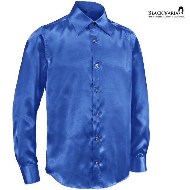 メール便可/1枚まで サテンシャツ 無地 光沢 ステージ衣装 ユニフォーム ドレスシャツ メンズ 日本製(シャイニーブルー青) 141405