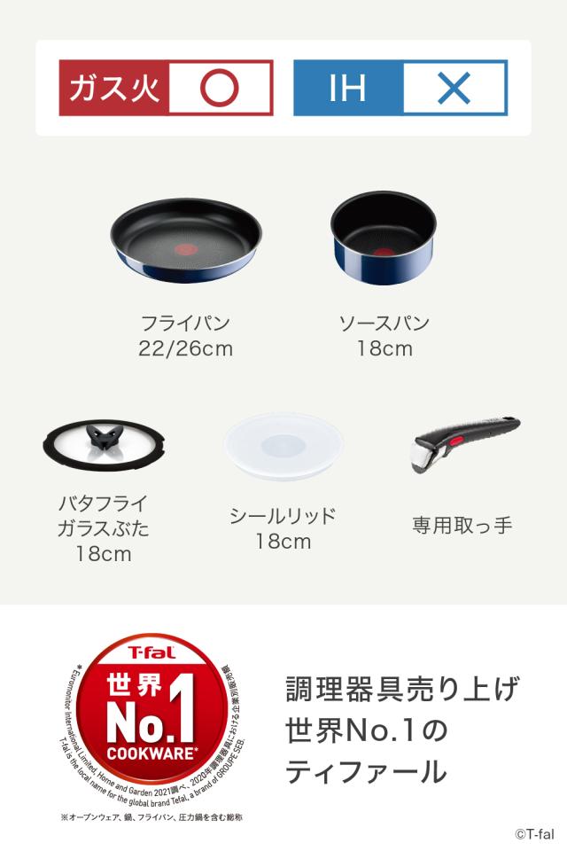 ●商品内容:フライパン 22/26cm、ソースパン 18cm、バタフライガラスぶた 18cm、シールリッド 18cm、専用取っ手 1本