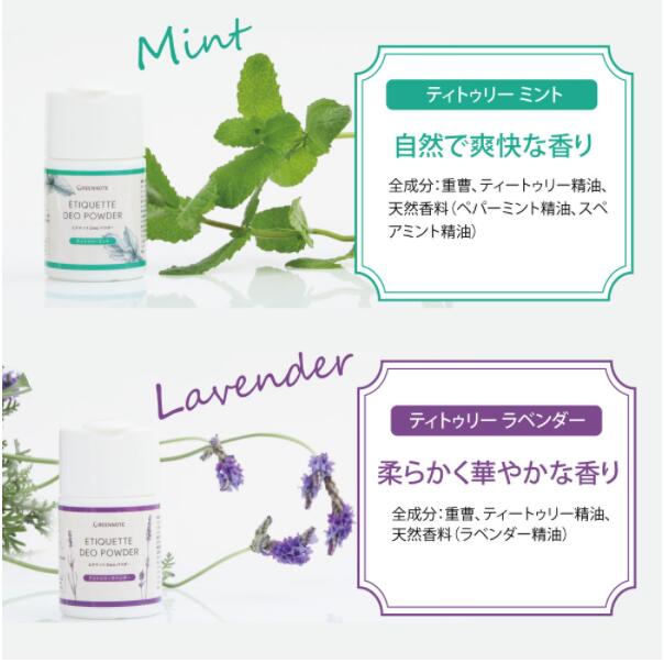 グリーンノート エチケットdeoパウダー ティトゥリーラベンダー 12g / ティトゥリーミント 12g 【ワキ 汗 ニオイ 対策】エチケットデオパウダー 天然100% ノンケミカル 重曹 天然成分100% 化学成分不使用 サラサラパウダー 日本製 定形外発送 送料無料 代金引換不可