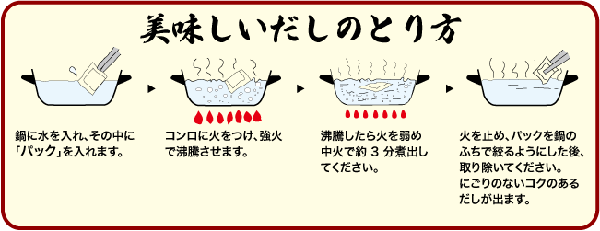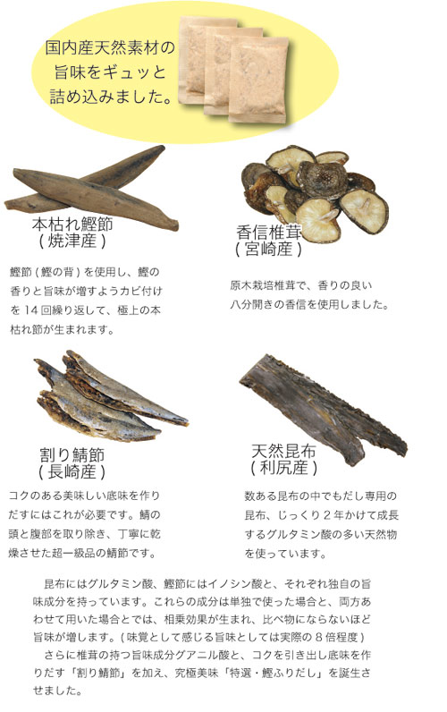 天然の素材にこだわった本品は焼津港からの鰹、宮崎産の椎茸、北海道産の利尻昆布、長崎産のサバ節を原料にした天然の風味です。