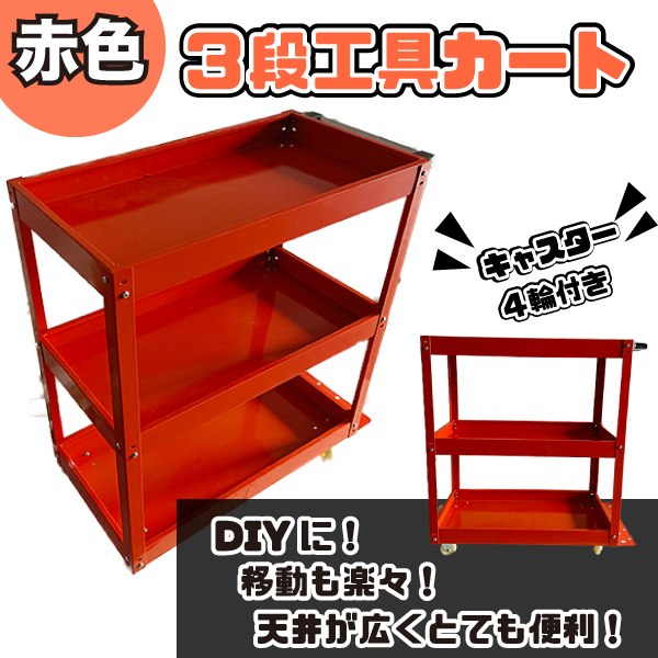 3段 工具カート キャスター付 ワーキングカート サービスツールカート サービス ワゴン台車 収納 トレー DIY 【DIY・工具】レッド