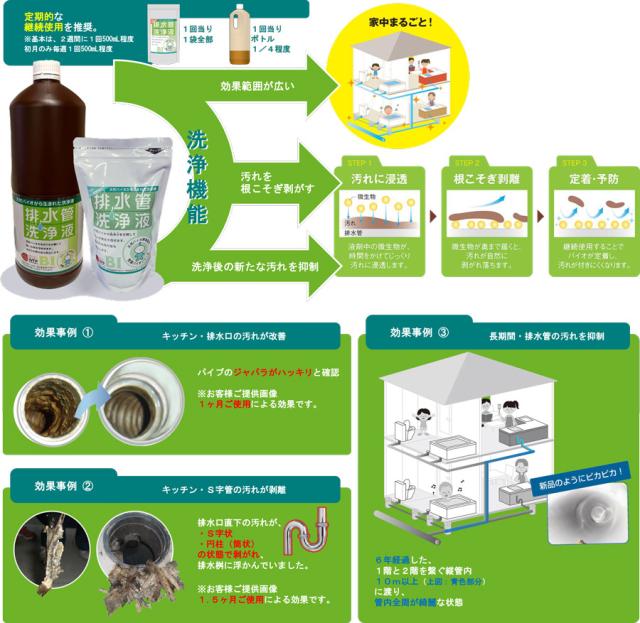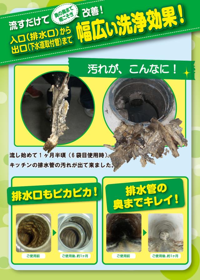●キッチン・洗濯機・お風呂の排水口、水洗トイレの便器などに ●排水口(入口)から下水道(出口)まで長い距離の排水管内へ洗浄効果を及ぼしやすい。