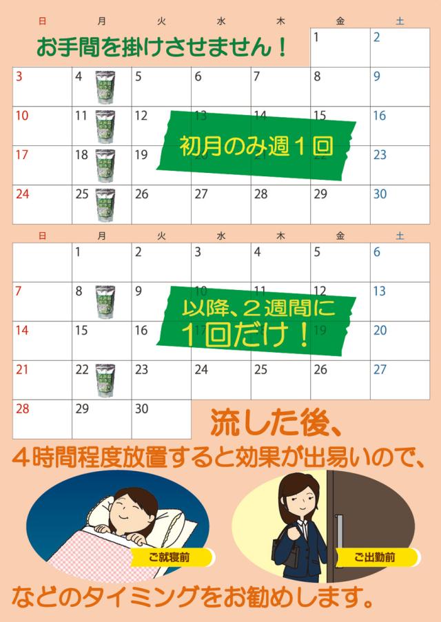 初めて使う場合は、目的の排水口に週1回を4回(1カ月)流してください。その後は2週間に1回のペースで継続して流してください。(流した後、4時間程度放置すると効果が出やすいので就寝前やお出かけ前などのタイミングがおススメです。)