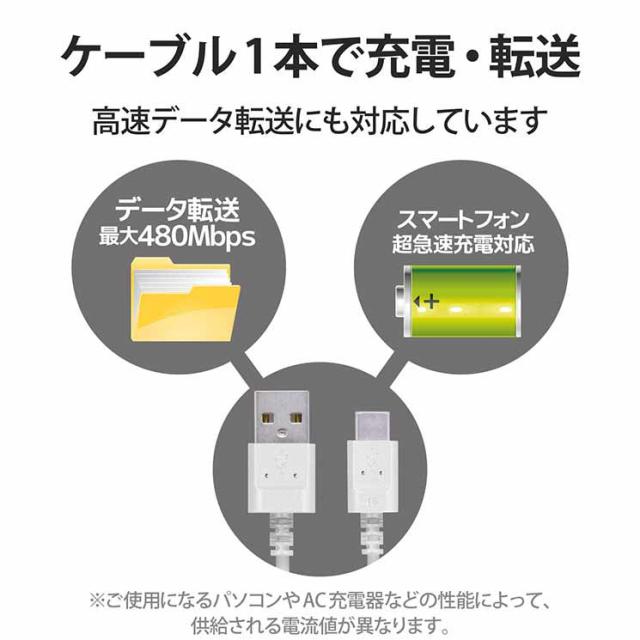 ■USB-Aを搭載しているパソコン及び充電器、モバイルバッテリーなどに、USB Type-C(TM)を搭載しているスマートフォンやタブレットを接続し、充電やデータ転送ができるUSB2.0ケーブルです。※USB Type-C and USB-C are trademarks of USB Implementers Forum■直径2.8mmの細くてとりまわしの良い極細ケーブルを使用しています。■最大15W(5V/3A)の大電流で接続機器の充電が可能です。 USB Power Delivery非対応です。■外部ノイズの干渉から信号を保護する2重シールドケーブルを採用しています。■ゴミの少ない簡易パッケージです。■コネクタ形状1:USB Type-C(TM) オス ■コネクタ形状2:USB-A オス ■対応機種:USB-A端子を持つパソコン・充電器・モバイルバッテリーおよび、USB Type-C(TM)端子を持つスマートフォン・タブレットなど■ケーブル長:1.0m ※コネクタ含まず ■ケーブル太さ:2.8mm ■規格:非認証品■カラー:ホワイト ■環境配慮事項:EU RoHS指令準拠(10物質、簡易パッケージ)