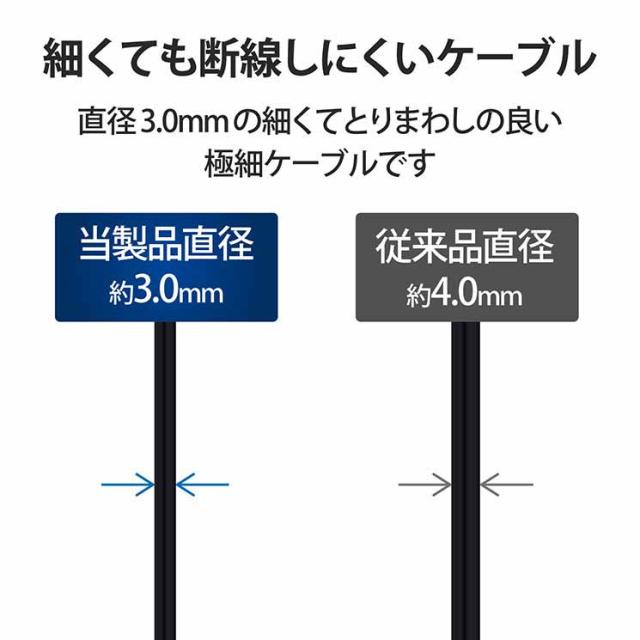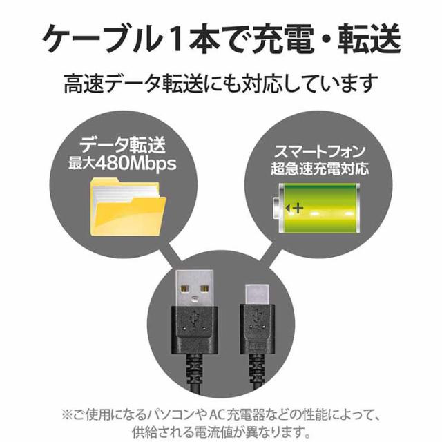 ■USB-Aを搭載しているパソコン及び充電器、モバイルバッテリーなどに、USB Type-C(TM)を搭載しているスマートフォンやタブレットを接続し、充電やデータ転送ができるUSB2.0ケーブルです。※USB Type-C and USB-C are trademarks of USB Implementers Forum■直径3.0mmの細くてとりまわしの良い極細ケーブルを使用しています。■最大15W(5V/3A)の大電流で接続機器の充電が可能です。 USB Power Delivery非対応です。■外部ノイズの干渉から信号を保護する2重シールドケーブルを採用しています。■ゴミの少ない簡易パッケージです。■コネクタ形状1:USB Type-C(TM) オス ■コネクタ形状2:USB-A オス ■対応機種:USB-A端子を持つパソコン・充電器・モバイルバッテリーおよび、USB Type-C(TM)端子を持つスマートフォン・タブレットなど■ケーブル長:2.0m ※コネクタ含まず ■ケーブル太さ:3.0mm ■規格:非認証品 ■環境配慮事項:EU RoHS指令準拠(10物質、簡易パッケージ)