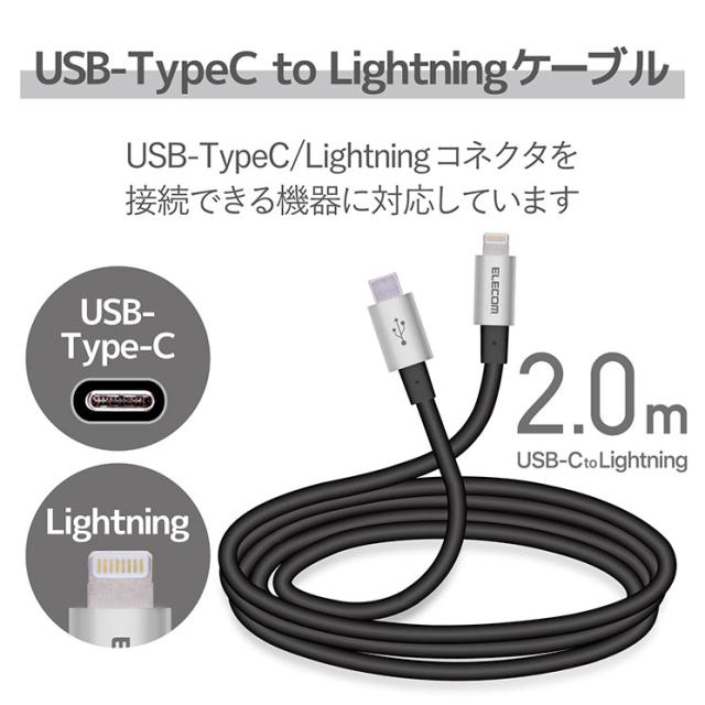 ■Lightningコネクタを搭載したiPhone・iPod・iPadと、USB-Cポートを搭載したパソコンを接続し、充電・データ転送ができるUSB-C to Lightningケーブルです。■USB Power Deliveryに対応し最大20V 3A(60W)の大電流を送電可能で、iPhoneの高速充電に対応しています。■※USB-C搭載iPadの充電には対応しておりません。USB-C搭載iPadからLightning搭載端末への給電は可能です。■対応したUSB-Cポート付きの充電器と接続することで、家庭用コンセントから充電可能です。■コネクタには本体カラーに合わせた高級感のあるアルミニウムを採用しています。■コネクタ形状1:Lightningコネクタ(オス) ■コネクタ形状2:USB-Cコネクタ(オス) ■長さ:2.0m ※コネクタ含まず ■使用目的・用途:USB-C端子を持つPC及び充電器とLightningコネクタを搭載したiPhone,iPad,iPodを接続し、充電・データ転送が可能です。■カラー:グレー ■その他:※iPhone8以降に発売されたUSB Power Delivery対応機種とUSB Power Delivery規格に対応した充電器を使用した場合、高速充電が可能。※iPadはUSB Power Delivery対応またはThunderbolt対応のUSB-C端子を持つパソコンの場合充電が可能。