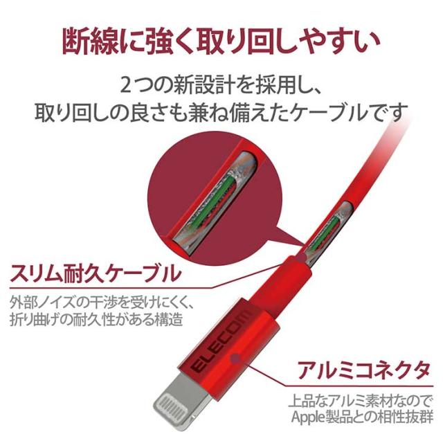 ■iPhoneやiPod、iPadなどのLightning端子搭載機器とパソコンを接続し、充電・データ通信が可能なLightningケーブルです。※iPadはパソコンからは充電できません。■新たな配線構造を採用し、断線に強く、取り回しの良さも兼ね備えた耐久仕様です。■Apple社製品に対応したUSBポート付きの充電器との接続で、家庭用コンセントから充電可能です。■断線しにくい高密度配線ケーブルを採用しています。■コネクタには本体カラーに合わせた高級感のあるアルミ素材を採用しています。■※スリムタイプコネクタ[10.9×6.2mm]を採用していますが、万が一ケースなどが干渉し挿入しにくい場合は、ケースなどを外してご使用ください。■コネクタ形状1:Lightning(オス) ■コネクタ形状2:USB A(オス) ■長さ:1.0m ※コネクタ含まず ■使用目的・用途:USB(A)端子を持つパソコン及びAC充電器とLightning端子を搭載したiPhone,iPad,iPodを接続し、充電・データ転送が可能です。※iPadはパソコンからは充電出来ません。■カラー:レッド