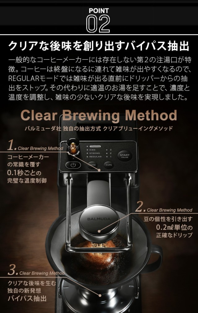 バリスタのハンドドリップのテクニックも叶わぬような、0.1秒ごとの緻密な温度制御、0.2ml単位の正確なドリップ。バルミューダ社の独自のテクノロジーによって実現した抽出法”Clear Brewing Method(クリアブリューイングメソッド)”です。さらに通常のコーヒーメーカーには存在しない、第2の注湯口を配置。この注湯口により、雑味のないクリアな味わいを実現しています。