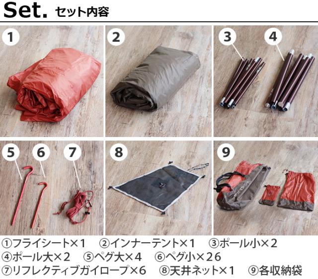 | フライシート×1、インナーテント×1、ポール小×2、ポール大×2、ペグ大×4、ペグ小×26、リフレクティブガイロープ(2.5mm)×6、天井ネット×1、ギャランティカード×1、各収納袋 |