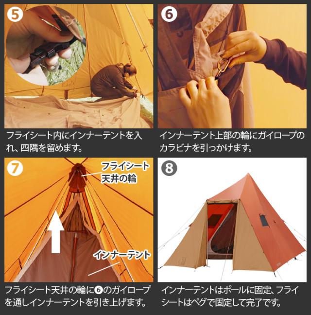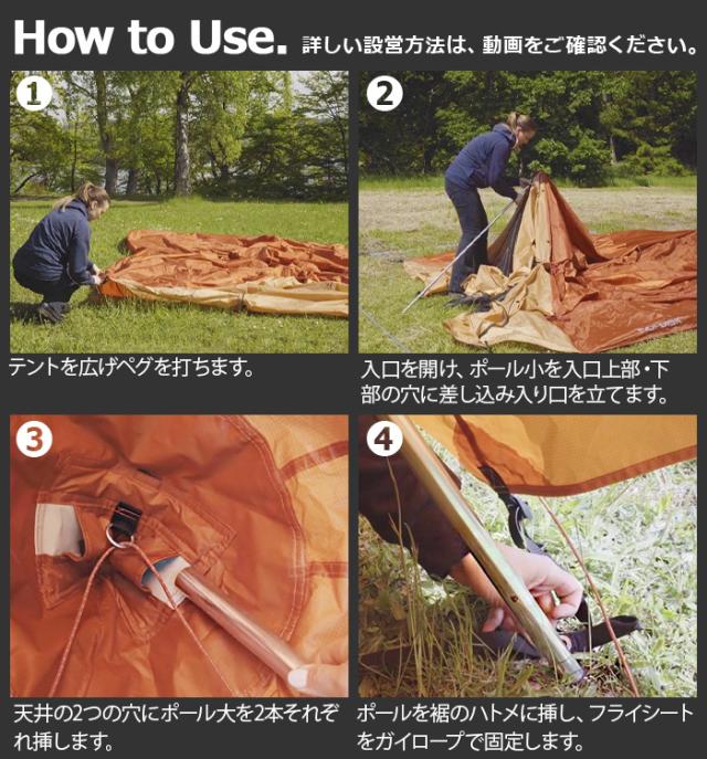 第1に、センターポールを取り除いた広々仕様!一般的なティピー形テントより有用なスペースを作り出しています。ポールもアルミポールを使用しているため、扱いやすく強力で軽量。また、フロアの形状が実用的な四角形で、空間を有効活用することができます。第2に、通常のティピー型テントには無い前室付き!荷物置きにも、雨や日よけ、テント内の換気など、多様なニーズに合わせて快適に使用することができるようになっています。二重傾斜により高さが確保でき、大きくかがむことなくテントへの出入りが楽におこなえます。