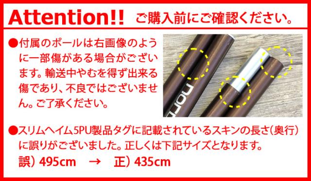 | 付属のポールは右画像のように一部傷がある場合がございます。輸送中やむを得ず出来る傷であり、不良ではございません。ご了承ください。 スイムヘイム5PU製品タグに記載されているスキンの長さ(奥行)に誤りがございました。正しくは下記サイズとなります。 誤)495cm→正)435cm |