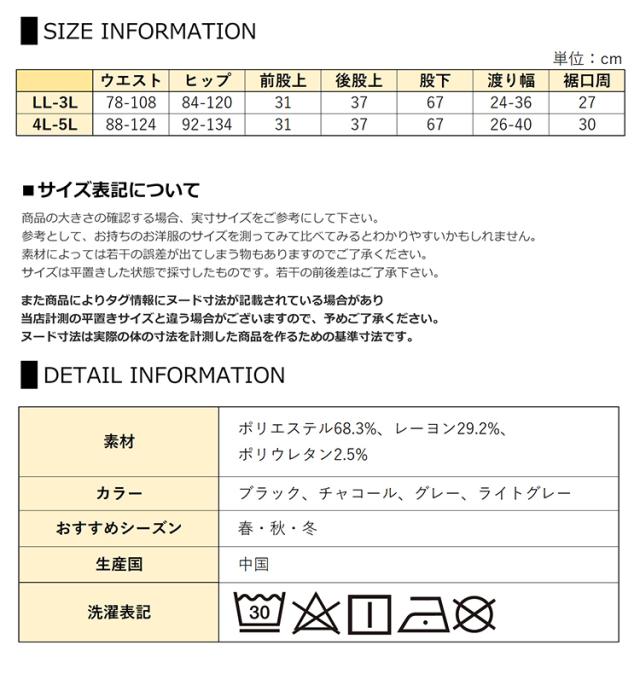 4L-5L:ウエスト88-124 ヒップ92-134 前股上31 後股上37 股下67 渡り幅26-40 裾口周30