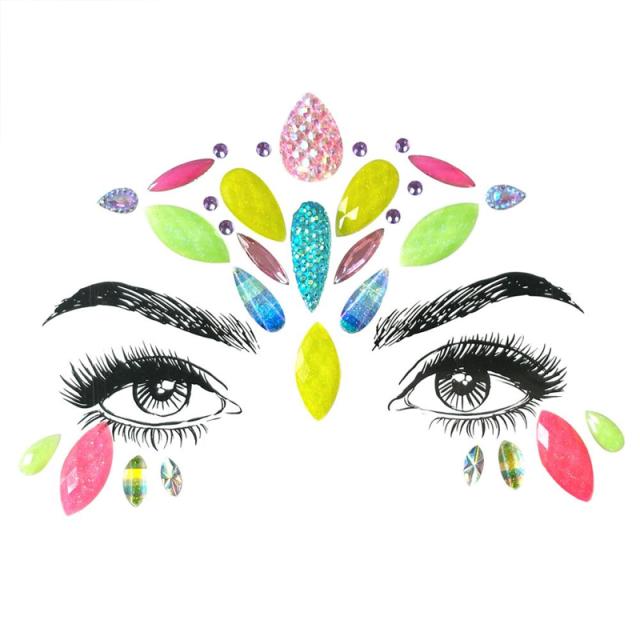 黄色イエローや緑色グリーン、ピンク色など様々な色合いのアクリルビジューを流線型やティアドロップ型の涙のようにデザインしたキラキラのグリッタージェムフェイスシール。