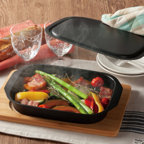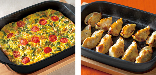 焼き物料理だけでなく、蓋付きなので餃子やオムレツなどふっくら蒸し焼き料理にも役立ちます。 耐熱温度の高い鉄製で、全体に均一に火が通るので外はこんがり中はジューシーに焼けます。揚げ物などの温め直しにも便利です。