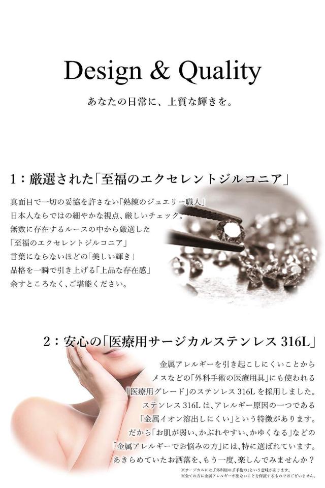 | 素材 | 地金:医療用サージカルステンレス 316L ルース(中石):ラウンド ブリリアント カット エクセレント キュービック ジルコニアcz ▼ステンレス316Lとは? 手術用メスやピンセットなどの医療用具にも数多く採用されてており、数あるステンレスの中でも、もっとも金属アレルギーを誘発しにくいと言われている金属の一つです。 医療現場で数多く使われていることから、「医療用ステンレス」「サージカルステンレス」とも呼ばれております。 「お肌が弱い、かぶれやすい、かゆくなる」などの「金属アレルギーでお悩みの方」には、特に選ばれている素材です。 傷が付きにくく水にも強いので、お手入れが簡単です。柔らかい布などで軽く拭くだけでOKです。 |