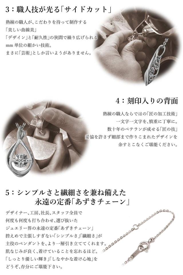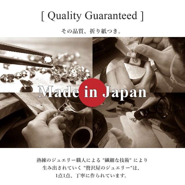 | 製造国 | 安心の日本製(山梨県) Made in Japan 国内屈指の卓越した技術を持つ山梨県のジュエリー工房にて制作。 この道数十年、熟練のジュエリー職人さんに、ベテランならではの厳しい目と手作業にて、1点1点を丁寧にお作り頂いております。 |