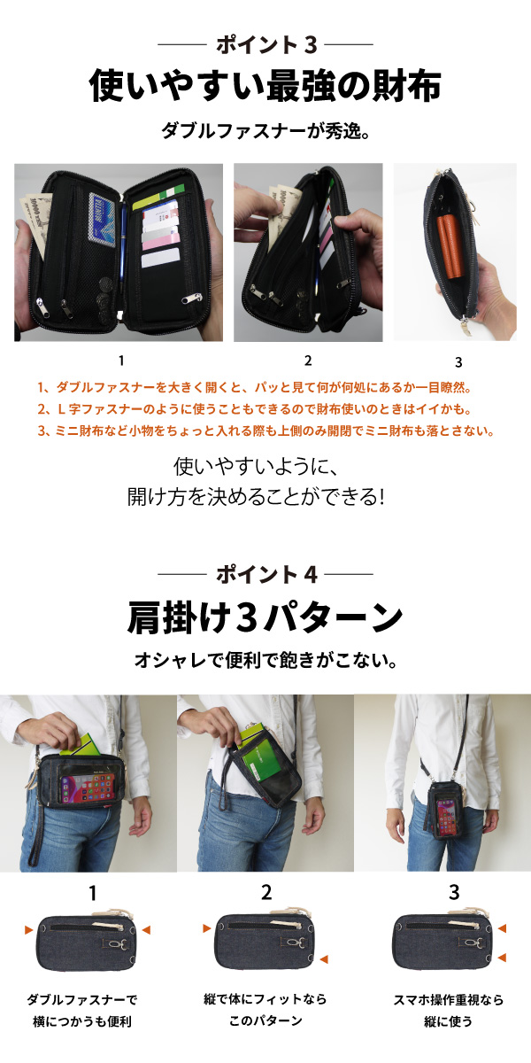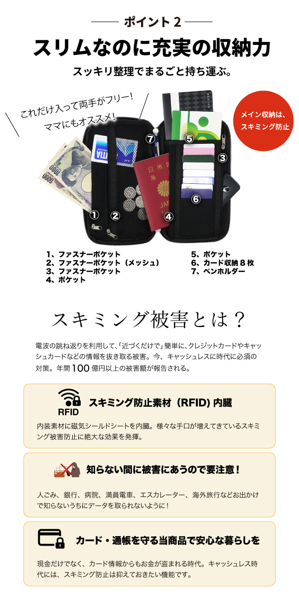 ・スッキリ整理でまるごと持ち運ぶ。メイン収納はスキミング防止機能。