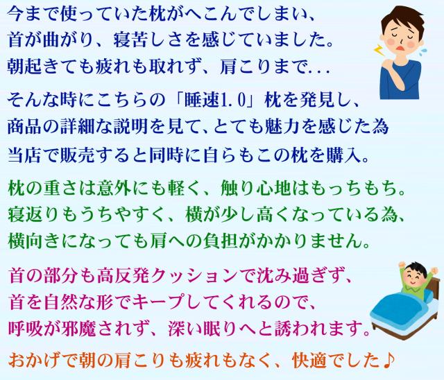しかし【睡速1.0】十分な高さがあるから枕が頭にフィットし続け、肩が窮屈にならず、首への負担も軽減できます。