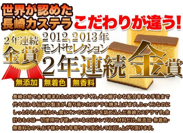 - 2年連続金賞に期待して初購入しましたが、パサって感じ。。牛乳と一緒に食べれば甘さがででくるかなぁと思いましたが、甘さ感じられず。味は焼きめの苦いほうが強く感じました。。スーパーの一袋入のカステラのほう...