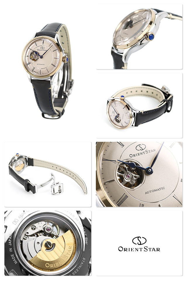正規品 7年保証キャンペーン 送料無料 オリエントスター クラシック セミスケルトン 森の木漏れ日 日本製 自動巻き レディース 腕時計 RK-ND0011N ORIENT STAR Classic Semi Skeleton アナログ パールグレー×グレー 革ベルト ◆「やさしいひかり」をデザインコンセプトにしたモデルが登場。変わらない日常や自然の景色から感じる穏やかな幸福感を、ナチュラルで淡いトーンのカラーダイアルで表現しました。文字盤の中央部分と9時位置のセミスケルトン部分にはダイヤカットを施し、大小のひかりの輪の重なりを表現。また、やわらかな曲線を描くボックスガラスやボンベ文字盤を組み合わせることで、クラシカルな印象を与えるデザインに。ベルトには横から見た時にも表面・裏面両方の素材が見える、フランス仕立てのベルトを採用し、クラシカルなデザインを引き立てる、雰囲気のある仕上がりを実現。台形形状により操作性を高めたりゅうずにはラインストーンをセットし、側面から見た時にもエレガントな表情を演出します。 発売日:21年9月発売 機械式腕時計 Made in Japan