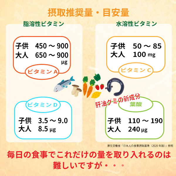 | □名称 ビタミンA、ビタミンD、ビタミンC、葉酸含有食品 |