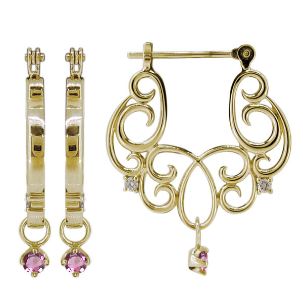 10月誕生石ピンクトルマリンを使用した18金製の、唐草(アラベスク)モチーフクロッシングピアスです。
