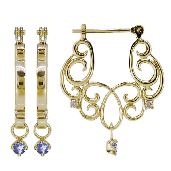 12月誕生石タンザナイトを使用した18金製の、唐草(アラベスク)モチーフクロッシングピアスです。
