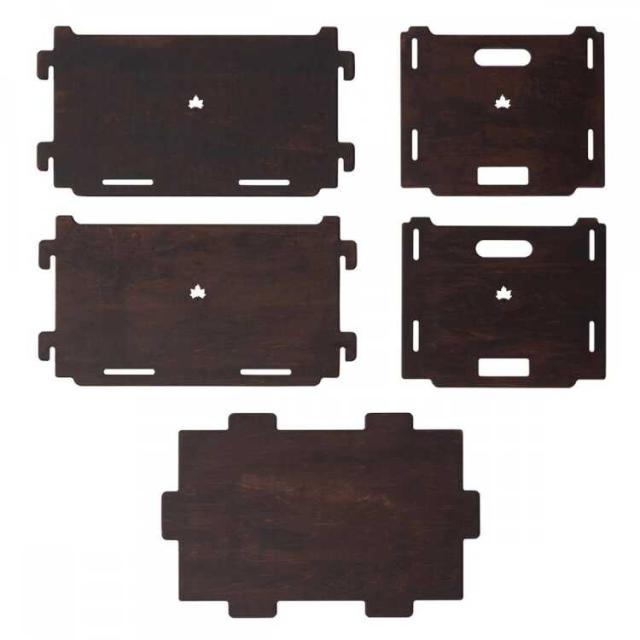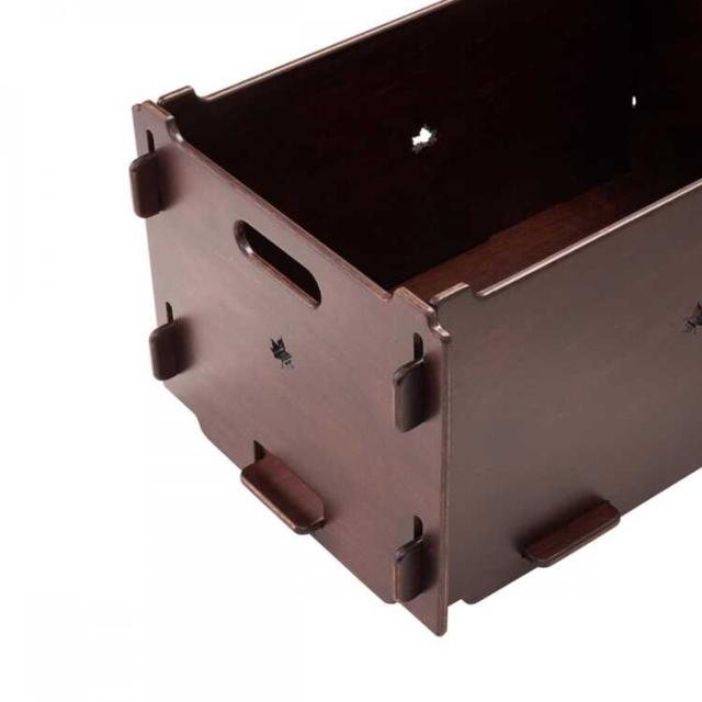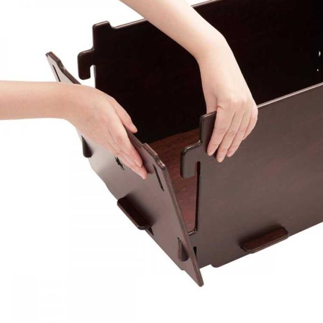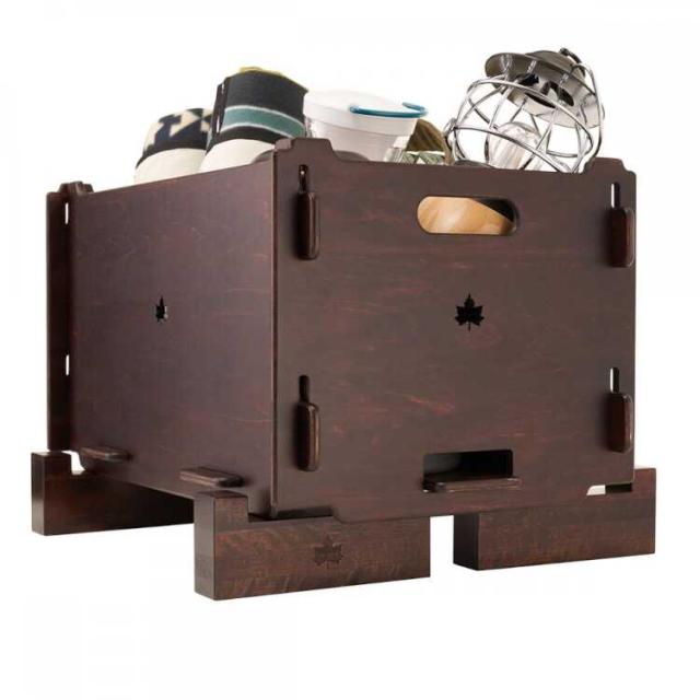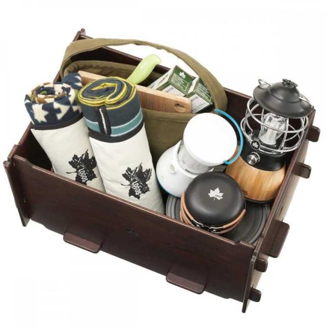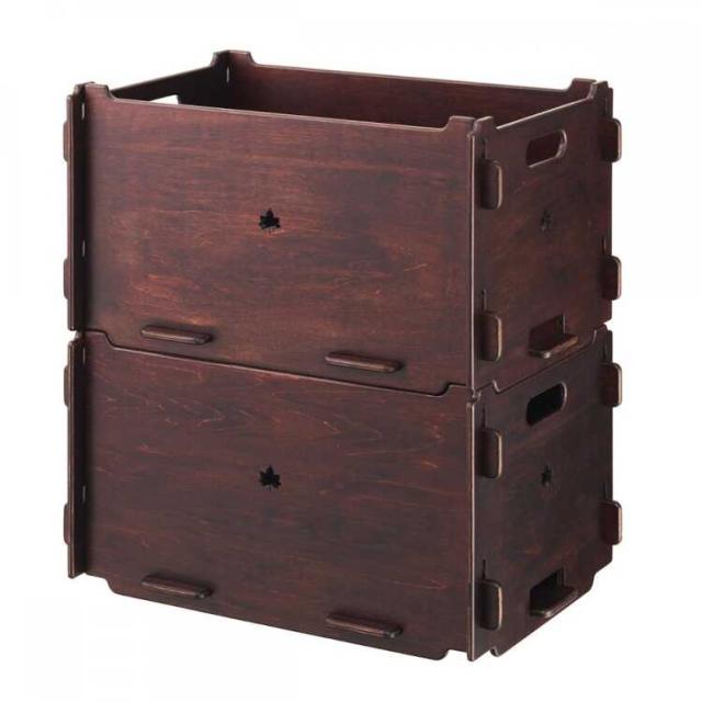 5枚の木板を組合わせるボックスは、クオリティにこだわった日本製。シンプル構造で、細かいキャンプグッズの収納に便利。同品をスタックしたり、物売品との組み合わせが可能です。落ち着いたダークブランの木板で、インテリアにも馴染みます。組立ては、ドライヤーやネジは不要で簡単に行えます。本品2台は縦積み・横積みでスタックが可能で、収納棚として使えます。また別売のデスクボードと組合わせれば、ローテーブルとしても使用可能、さらに別売のウッドスリーパーと組合わせれば、底面の汚れや水滴の付着を防止することができます。