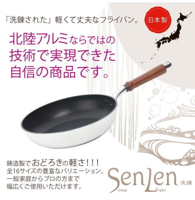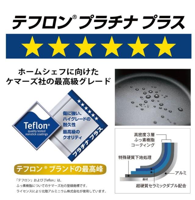 【材質】本体/アルミ-マグネシウム合金(玉子焼き器を除く)、内面/ テフロンTMプラチナプラス加工・リップルウェーブ加工(玉子焼き器を除く)、外面/ミラー仕上げ、底面/ サテン仕上げ、取っ手/天然木
