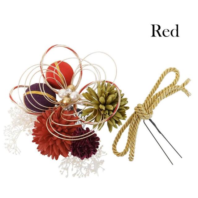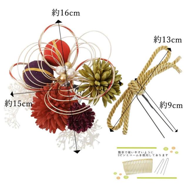 髪飾り 成人式 かすみ草 赤 つまみ細工 ピンポンマム 花 飾り 飾り紐 組紐 コーム Uピン 卒業式 振袖 2点セット