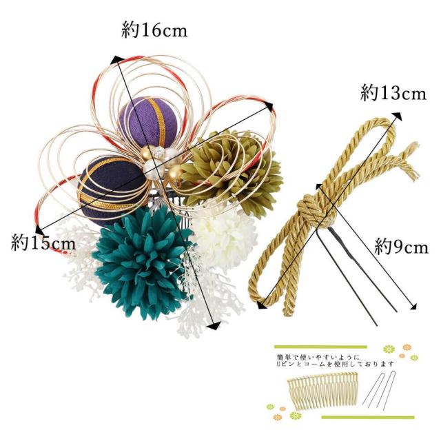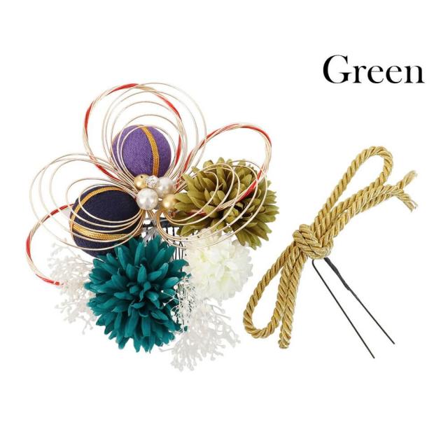 髪飾り 成人式 つまみ細工 かすみ草 ピンポンマム 緑 花 飾り 飾り紐 組紐 コーム Uピン 卒業式 振袖 2点セット