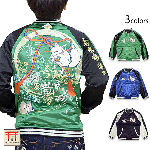 愛らしい狐のキャラクターが主役の【今昔】から「家紋デザインのリバーシブルスカジャン(KJ-29040)」のご紹介です。