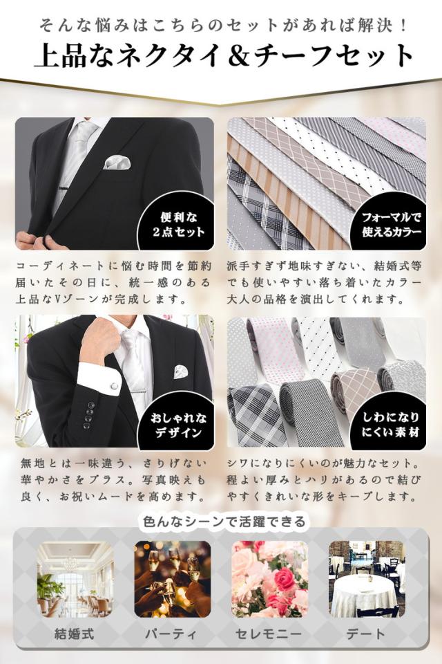 フォーマルなイベントに便利なネクタイ・ポケットチーフの2点セットです
