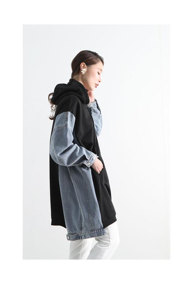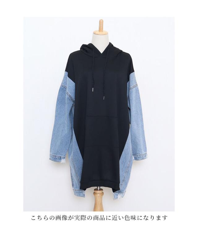 冬新作 デニム切替のゆったりパーカーチュニック レディース ファッション トップス チュニック パーカー ブラック 黒 デニム 大人可愛い 40代 レディースファッション 50代女性 ファッション 60代 ミセスファッション サワアラモード sawa a la mode otona mode-7012